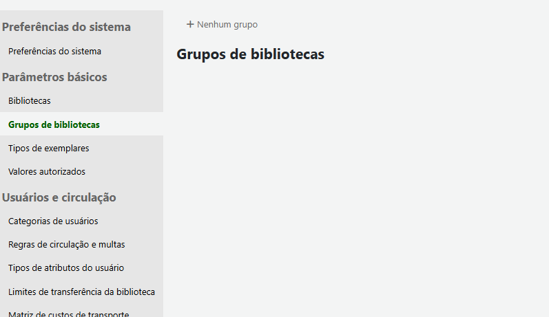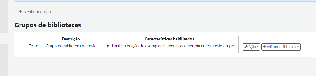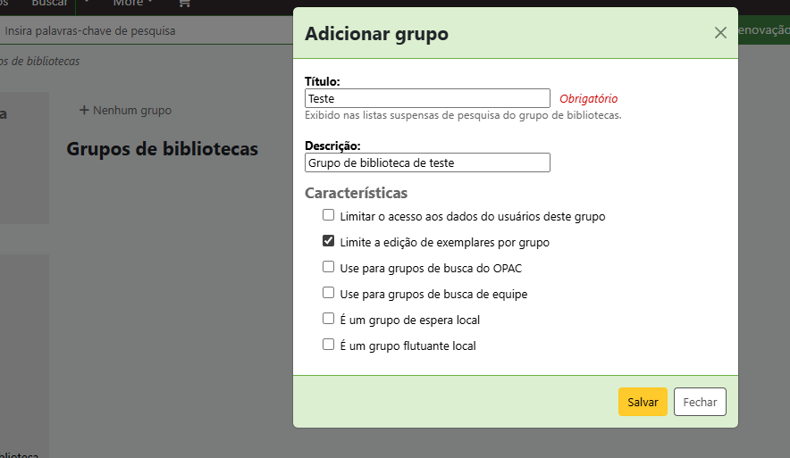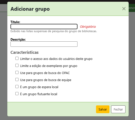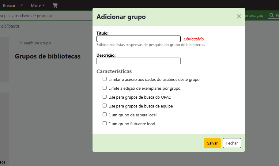 Em Administração > Grupos de Bibliotecas você irá clicar no “+” que fará surgir uma pequena tela pop-up: