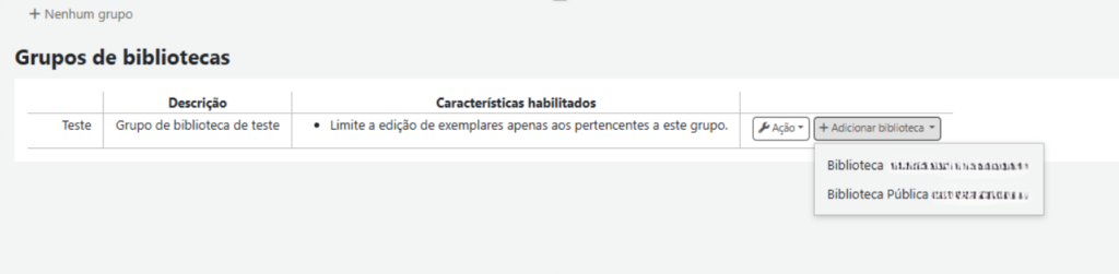 Adicione bibliotecas ao grupo: clique no botão “+ Adicionar biblioteca” ao lado do grupo criado e selecione as unidades.